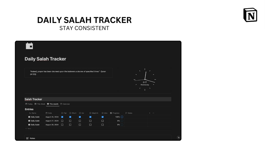 This template is more than just a tracker; it's a tool to help you build a consistent, mindful Salah routine. Whether you're looking to deepen your spiritual practice or simply stay more organized, this Notion template makes it easy to prioritize your prayers.