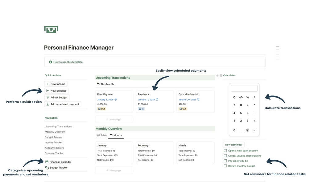 This all-in-one Personal Finance Manager Notion template is designed to help you track, manage, and plan your finances like a pro. Whether you’re budgeting for the month, tracking income and expenses, or planning for upcoming transactions, this template has everything you need to stay on top of your financial goals.