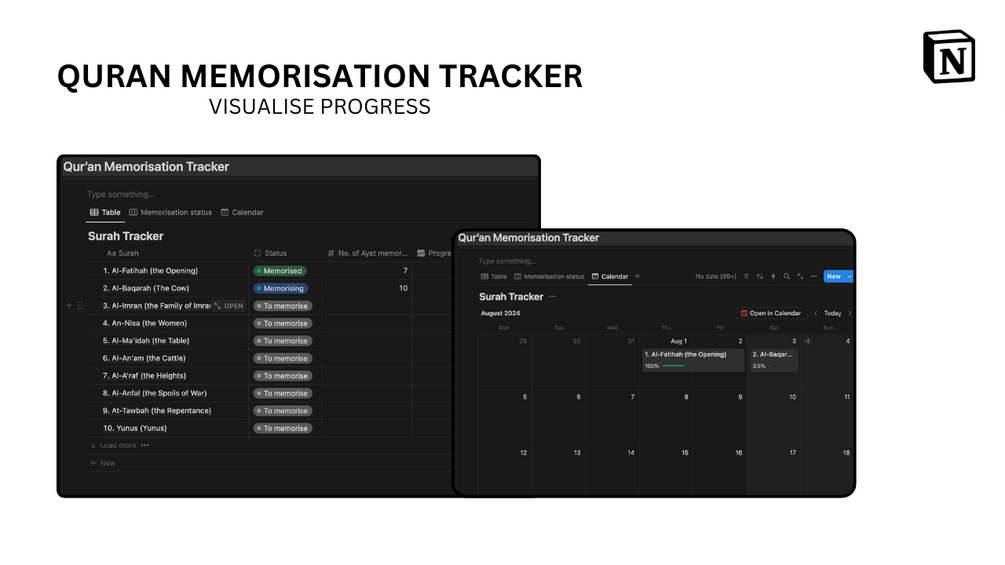 Introducing the Notion Hifdh Companion Template – your ultimate tool for Quran memorization and study, crafted to support and elevate your spiritual journey. This all-in-one template is designed to help you track, study, and reflect on the Quran efficiently, providing everything you need in one place.